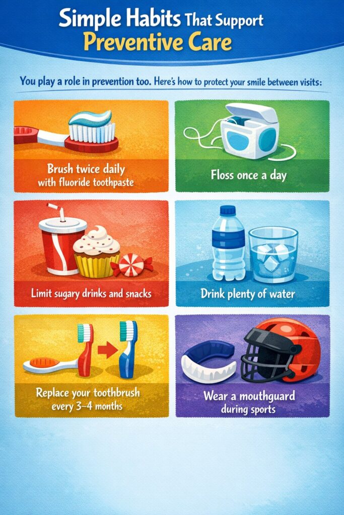 You play a role in prevention too. Here’s how to protect your smile between visits: